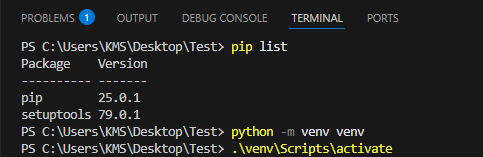 입력 후 활성화 코드(".\venv\Scripts\activate")를 입력하면 됩니다.