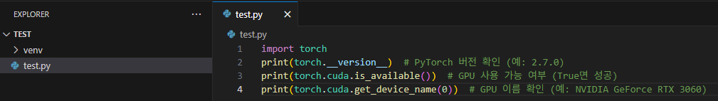 - 위에 있는 코드를 복사, 붙여넣기 후 파일을 실행해 GPU 사용 가능 여부를 확인합니다.