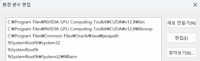 C:\Program Files\NVIDIA GPU Computing Toolkit\CUDA\v12.8\bin | CUDA 실행파일 경로 |